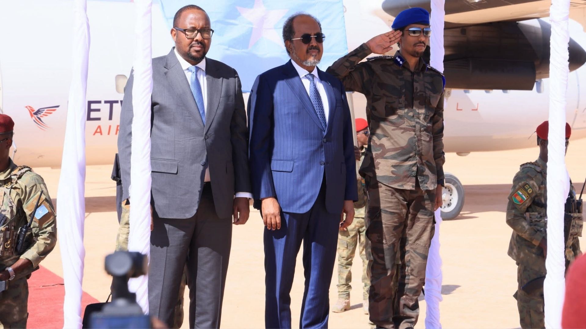 Madaxweynaha iyo wafdigiisa waxaa Laascaanood uga sii horreeyay Ra’iisul Wasaaraha Soomaaliya, Xamsa Cabdi Barre, oo ay wehliyaan wasiirro ka tirsan golaha xukuumadda, xildhibaanno, iyo mas’uuliyiin siyaasadeed oo ka kala yimid dowlad-goboleedyada dalka.